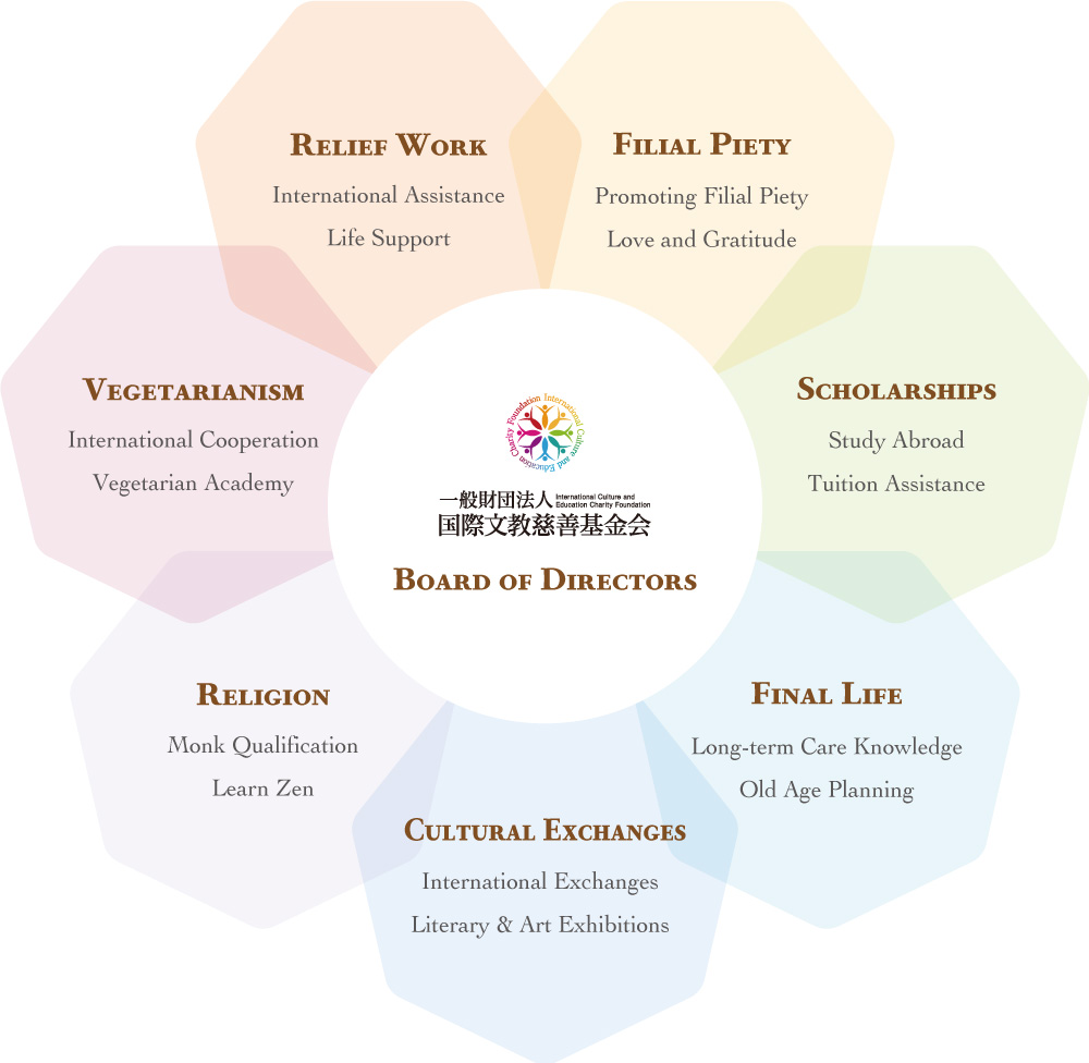 The foundation is committed to seven key areas: humanitarian aid, filial piety culture, vegetarianism, scholarships, religion, cultural exchange, and end-of-life planning. Through these efforts, we aim to spread love and hope, bringing positive change to the world.